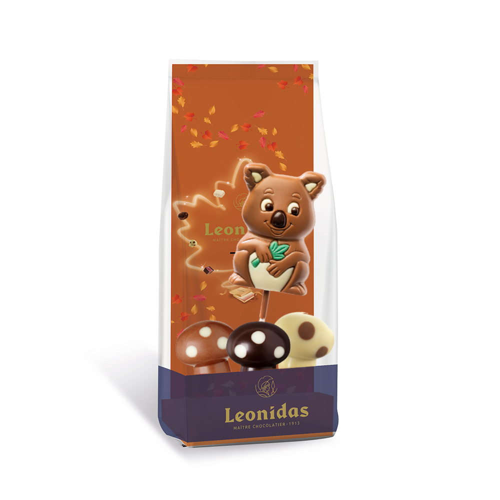 Sleeve com 3 bombons da Coleção de Outono Leonidas e 1 Chupa de Chocolate