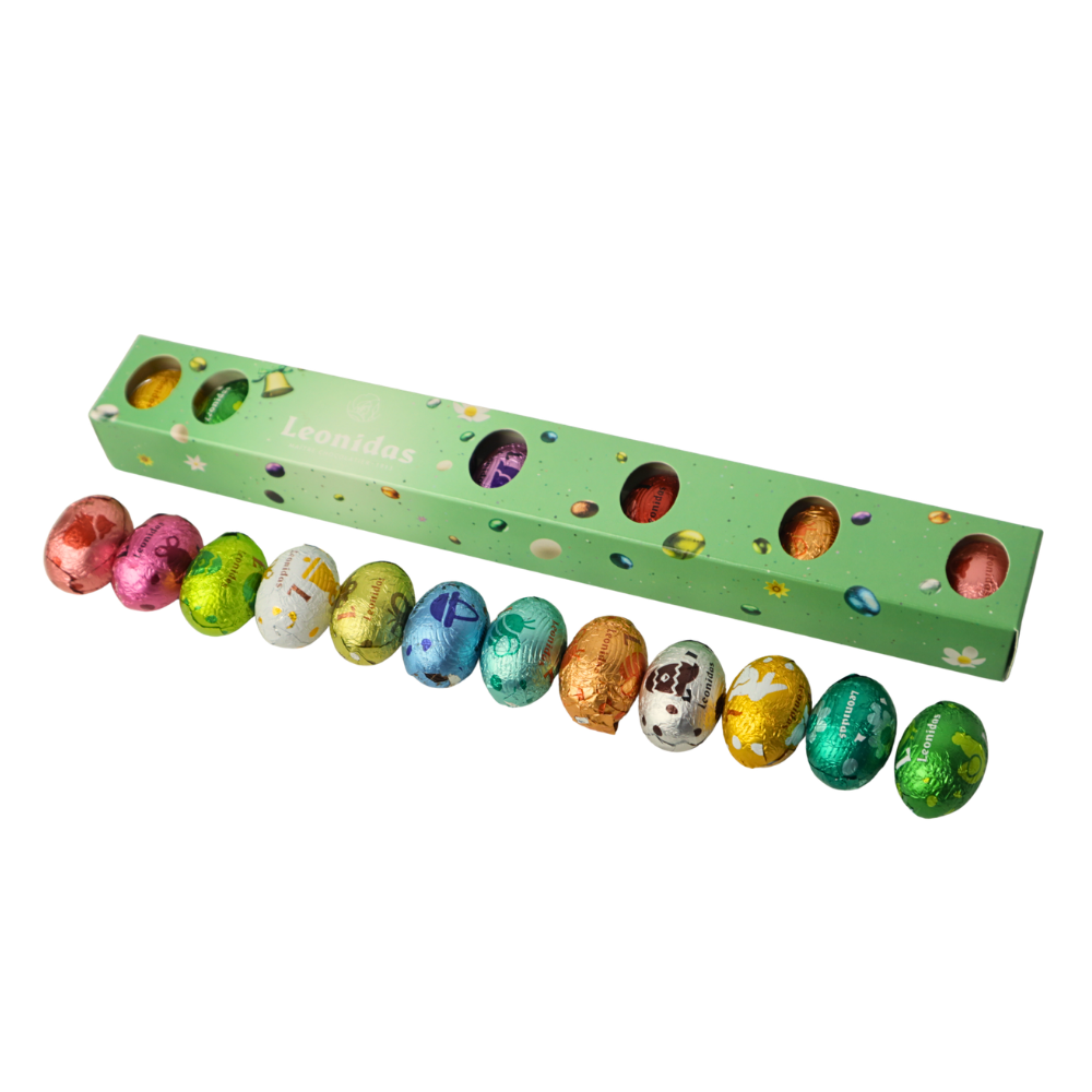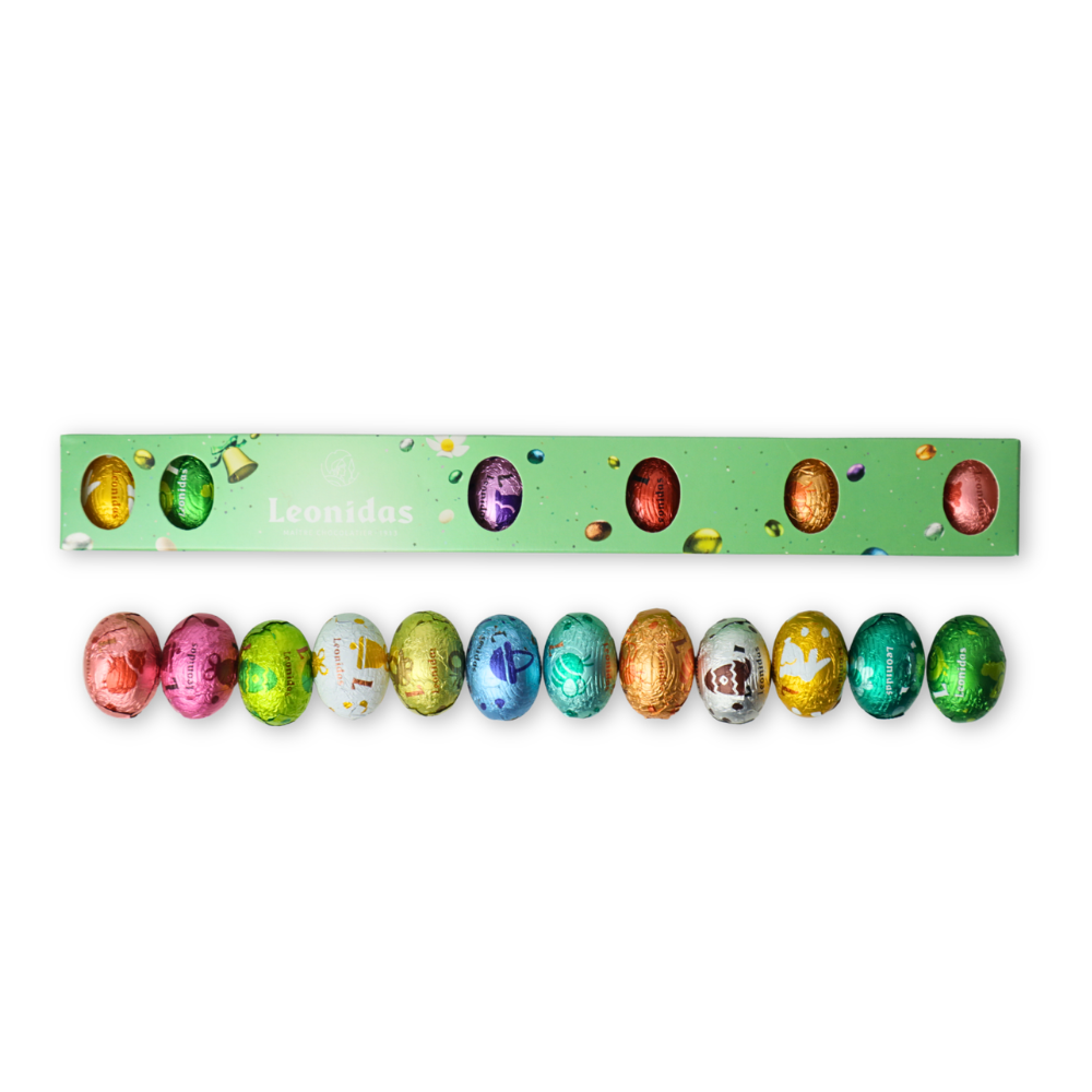 O Sortido de Ovos de Páscoa é feito respeitando as tradições, com manteiga de cacau 100% pura, sem óleo de palma e recheado com crocantes e saborosos pequenos ovos de Páscoa de Leonidas. Uma gama de sabores para o ajudar a descobrir a nossa seleção de Páscoa. Chocolate negro, leite e branco, praliné, caramelo, natas …